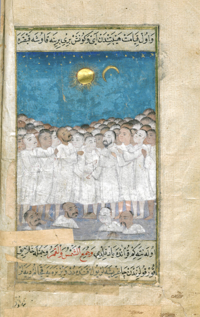 The conjunction of the sun and the moon on the Day of Judgment. Anonymous, Aḥwāl al-Qiyāma (Conditions of Resurrection). Ottoman Istanbul or Baghdad, late 16th century. Staatsbibliothek zu Berlin, Ms. Or. Oct. 1596, f. 26v