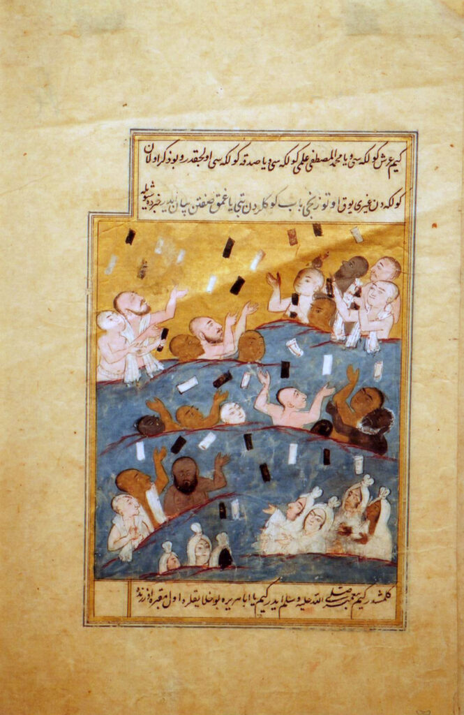The raining down of the books of deeds on the Day of Judgment. Anonymous, Aḥwāl al-Qiyāma (Conditions of Resurrection). Ottoman Istanbul or Baghdad, late 16th century. Free Library, Philadelphia, T4